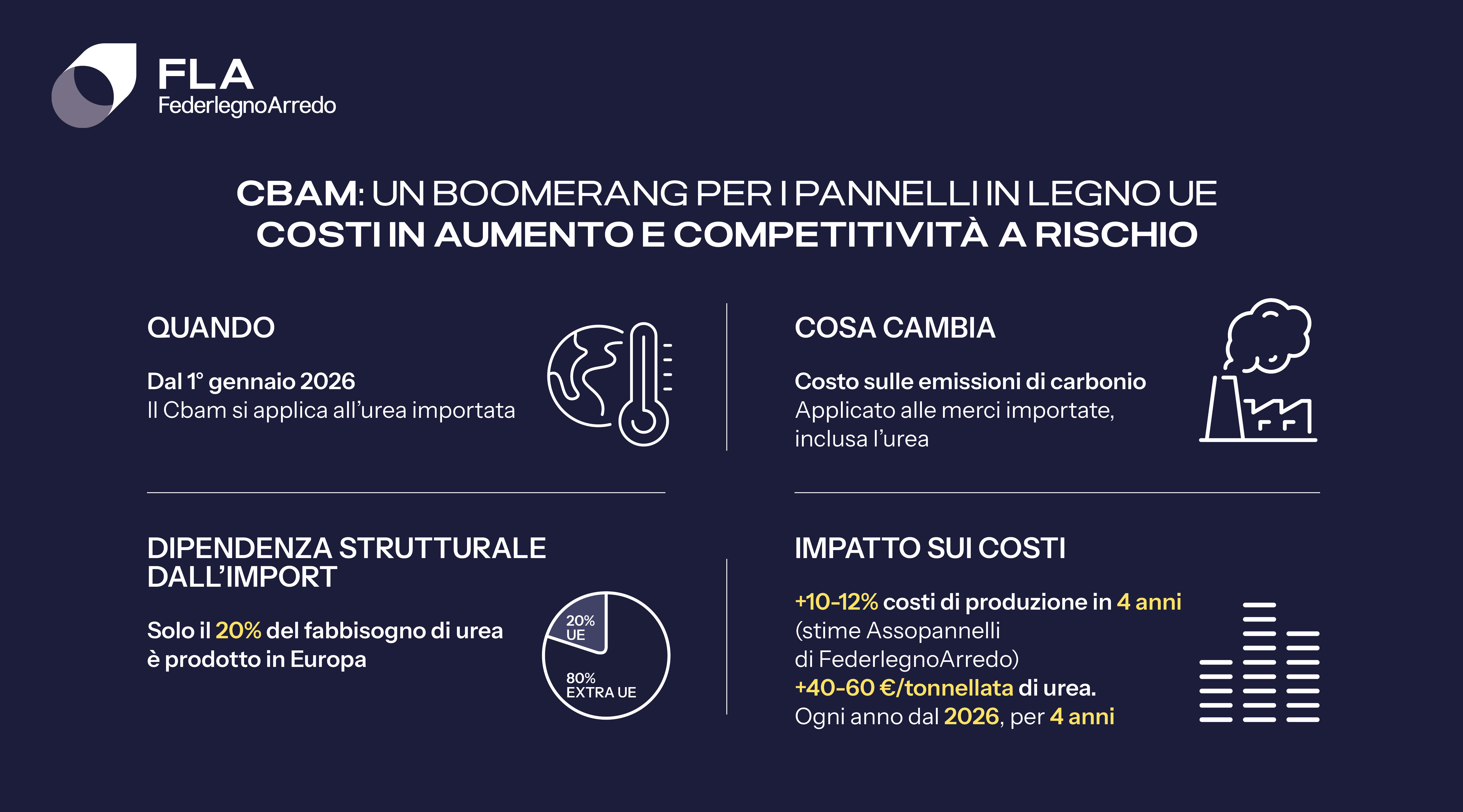 Assopannelli ed EPF, riunite oggi presso la sede di FederlegnoArredo, chiedono la sospensione del Cbam sull’urea industriale, materia prima essenziale per colle, resine e produzione di pannelli in legno per edilizia e arredamento. Dal 1° gennaio 2026 il Cbam applica un costo alle emissioni di carbonio contenute in alcune merci importate, inclusa l’urea. Secondo le stime di Assopannelli, il Cbam potrebbe aumentare i costi di produzione dei pannelli in legno di circa il 10%/12% in 4 anni essendoci un incremento pari a 40–60 euro per tonnellata dell’urea dal 1° gennaio 2026 ripetuto per 4 anni, con ripercussioni sull’intera filiera del mobile europeo.