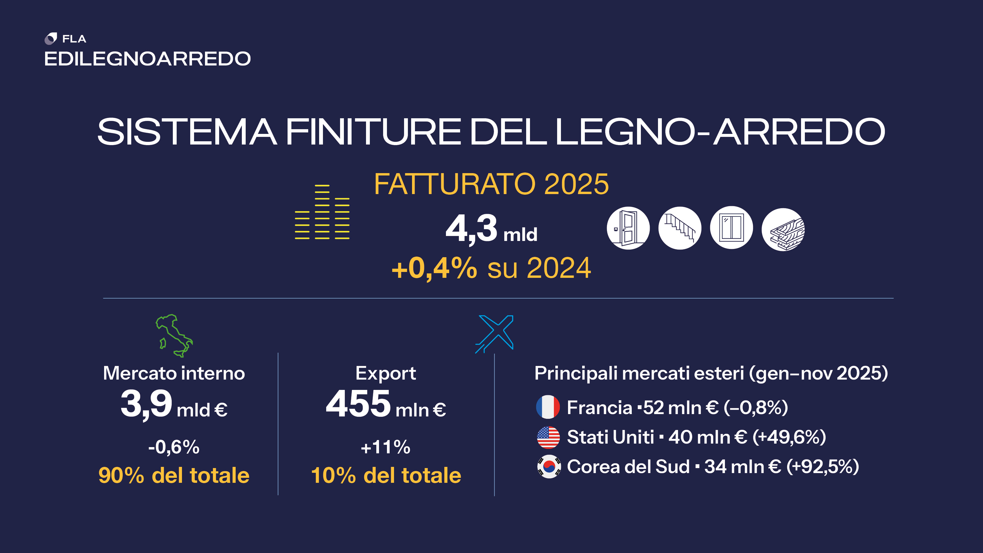 Nel 2025 il fatturato alla produzione del Sistema Finiture per edilizia si attesta complessivamente a oltre 4,3 miliardi di euro (+0,4% sul 2024). Il mercato nazionale, che rappresenta il 90% del totale, si mantiene sostanzialmente stabile (-0,6%) per un valore di circa 3,9 miliardi di euro, nonostante il ridimensionamento degli incentivi fiscali. In aumento le esportazioni, che raggiungono i 455 milioni di euro (+11%), con performance positive in tutti i comparti e particolare dinamismo per porte interne e pavimenti in legno. La Francia si conferma primo mercato estero per le finiture per edilizia (52 milioni di euro nel periodo gennaio-novembre 2025). Crescono gli Stati Uniti, che diventano la seconda destinazione, mentre la Corea del Sud si conferma primo mercato per i pavimenti in legno. In forte calo le esportazioni verso la Cina, che esce dalla top ten, sostituita dagli Emirati Arabi Uniti.