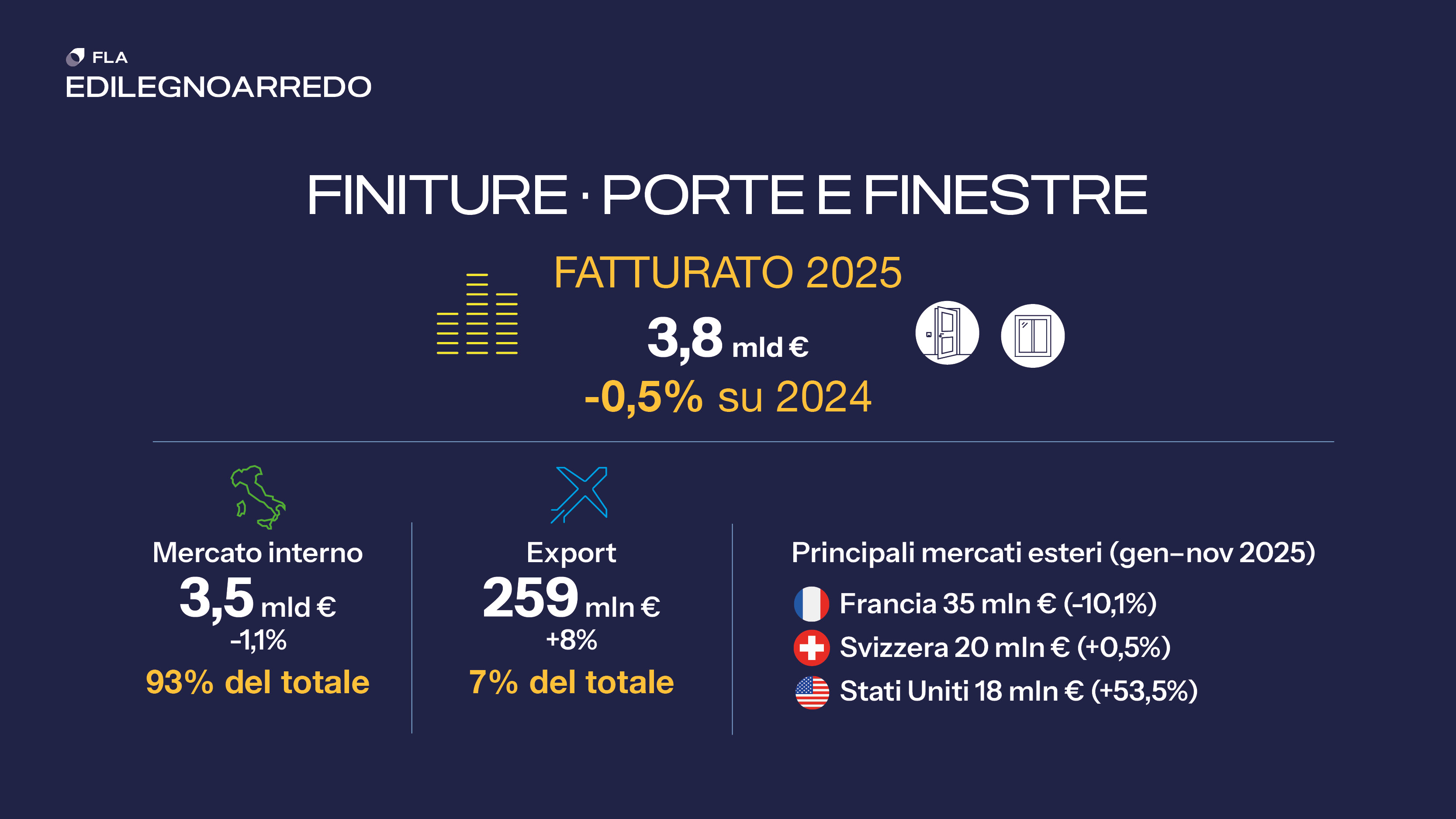 Stabile il fatturato (-0,5) alla produzione delle imprese di Finestre di legno e legno-alluminio, Porte interne e porte d’ingresso che chiude il 2025 a poco meno di 3,8 miliardi di euro. Il mercato di riferimento è l’Italia, in lieve flessione (-1,1%) cui viene destinato il 93% della produzione. In crescita anche le esportazioni (+8%) che sfiorano i 260 milioni di euro. La Francia, nonostante la flessione più marcata, si conferma la prima destinazione dei prodotti italiani, seguita da Svizzera e Stati Uniti.